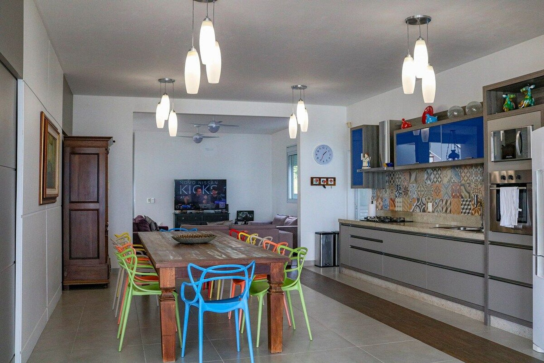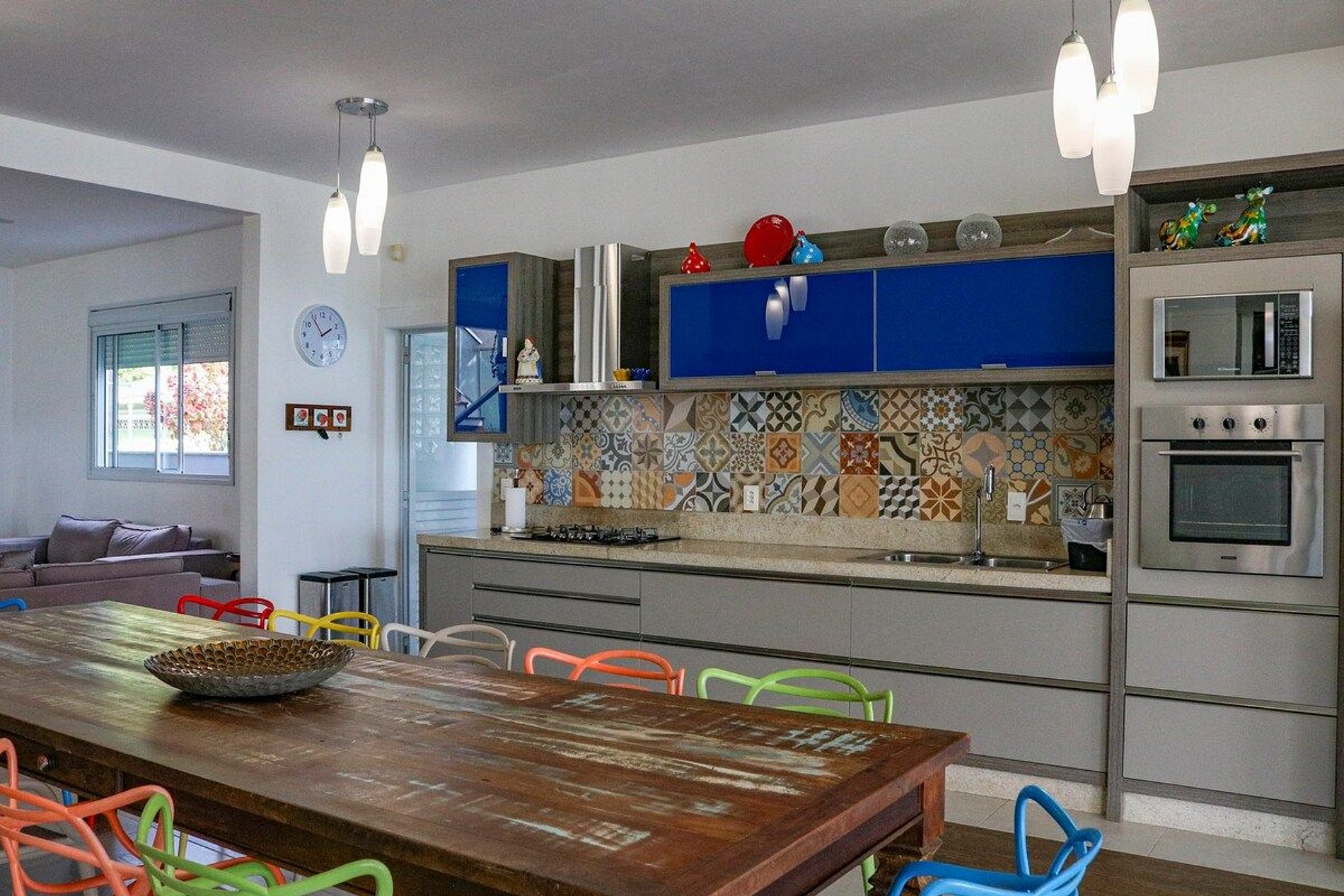 Cozinha: Mesa comunitária 12 lugares e Geladeira, Fogão, Microondas e os utensílios de cozinha.