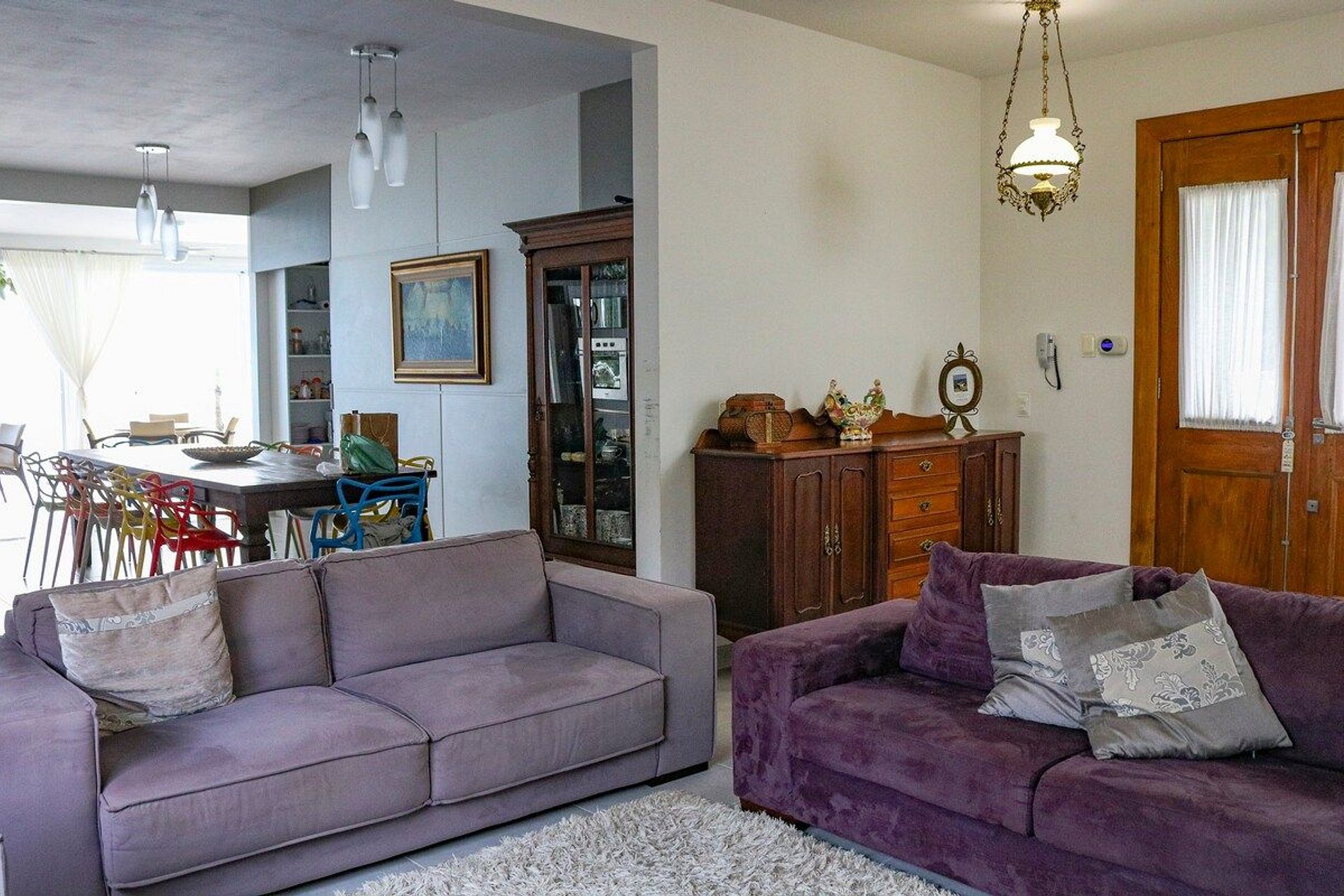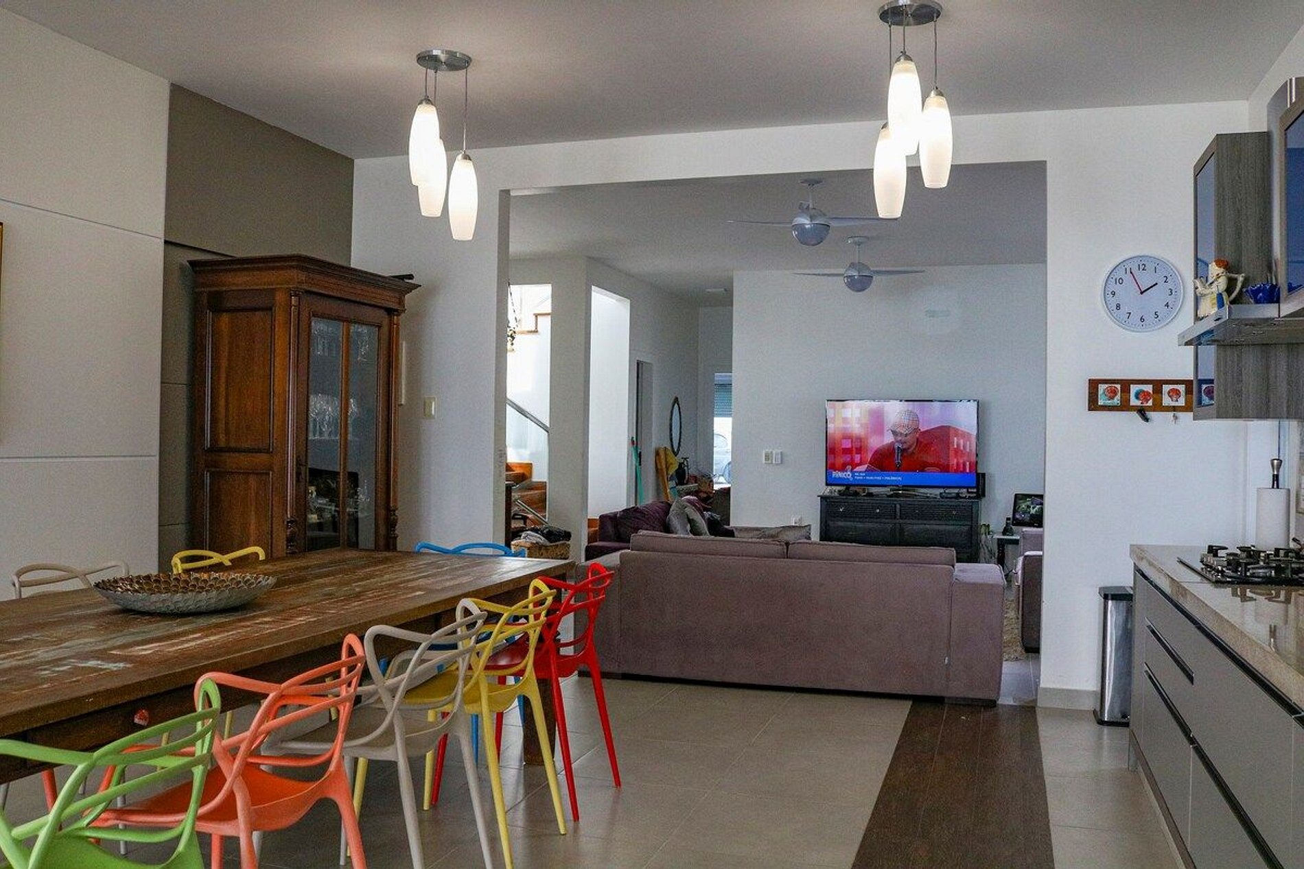Sala TV: 3 sofás de 3 lugares, aparador e tv de 55 polegadas, modem roteador internet claro 240 Mega.