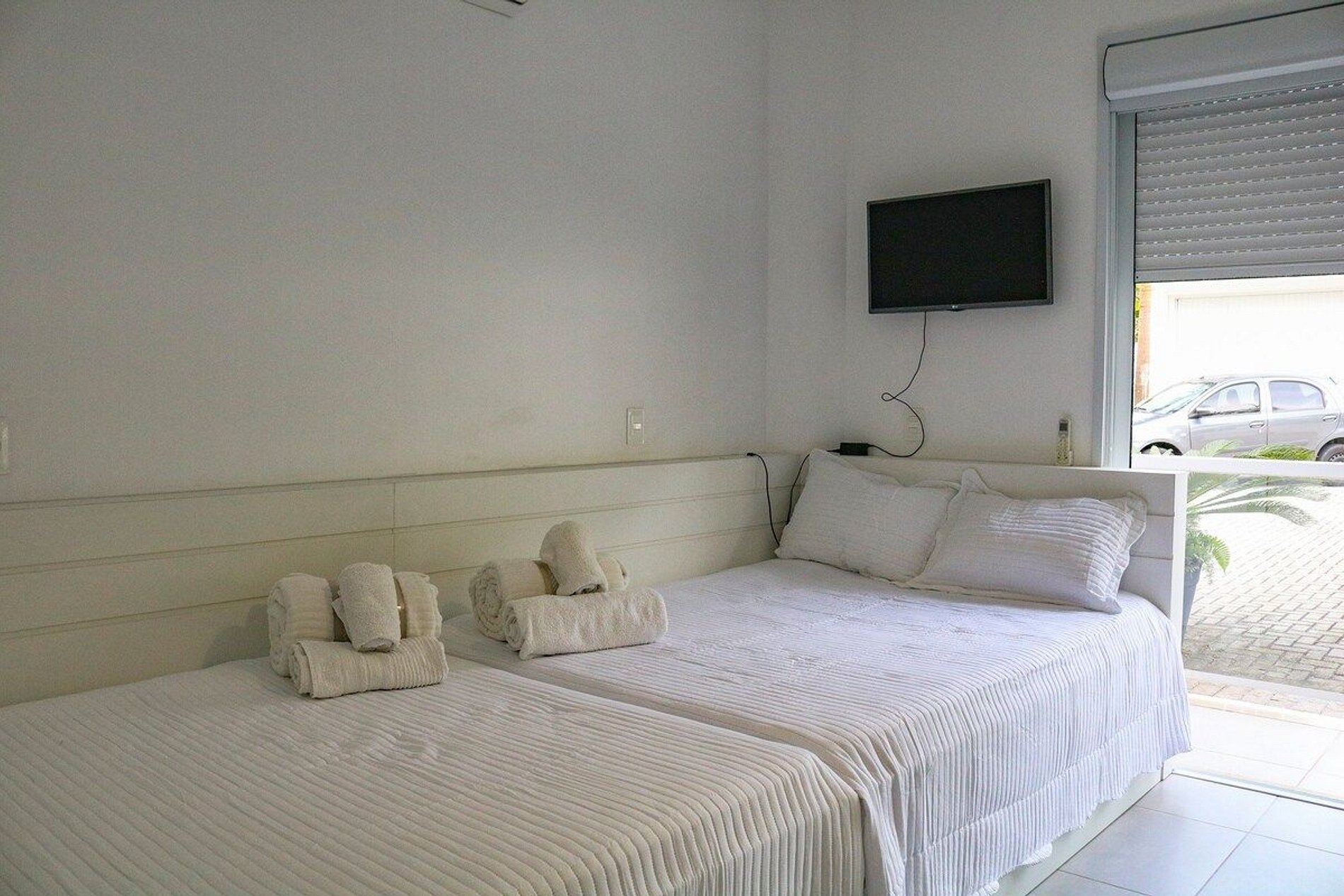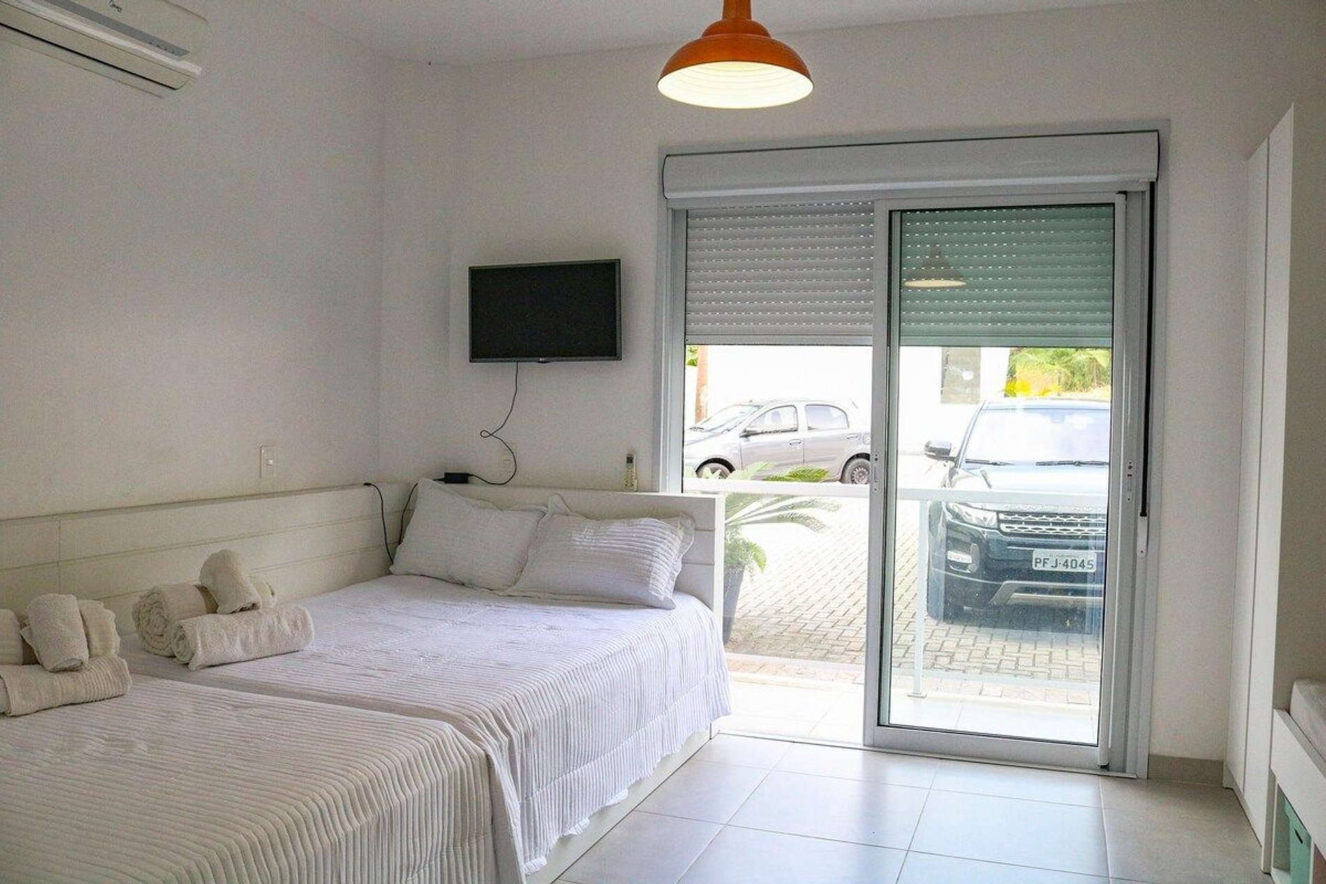 Suíte 04: 02 camas casal + 02 camas retrátil casal e 1 cama solteiro, TV 32 polegadas, guarda roupas, cabides e uma porta janela com persiana de alumínio, sacada, ar condicionado. O banheiro com armário embutido e espelho e chuveiro a gás.