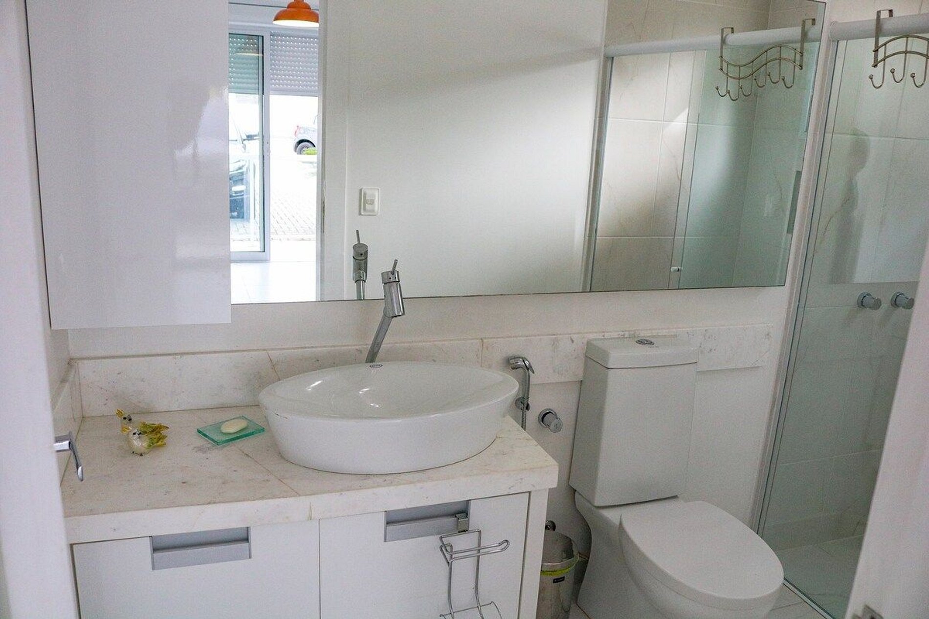 Suíte 02: 01 cama queen, TV 32 polegadas, guarda-roupa, cabides e uma porta janela com persiana de alumínio, sacada, ar condicionado. O banheiro com armário embutido e espelho e chuveiro a gás.