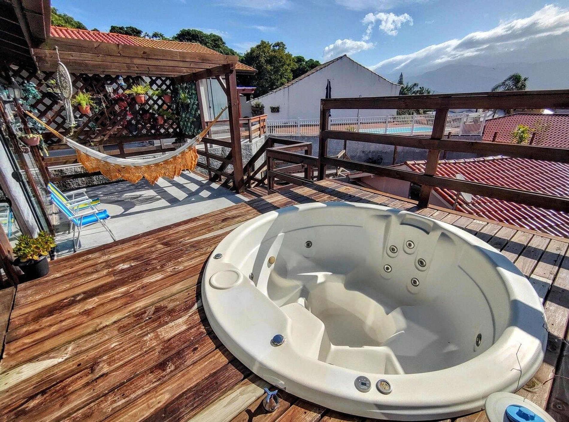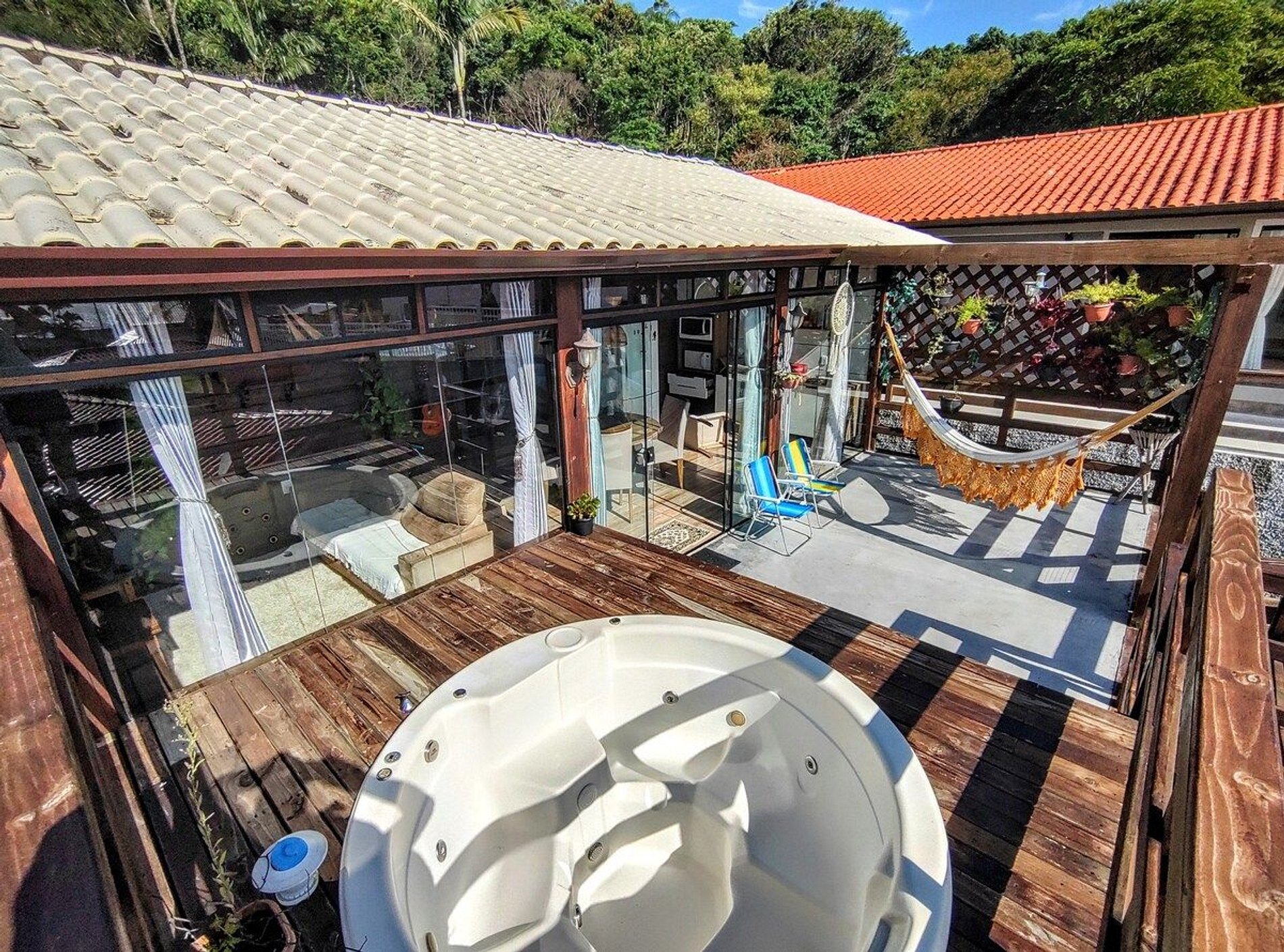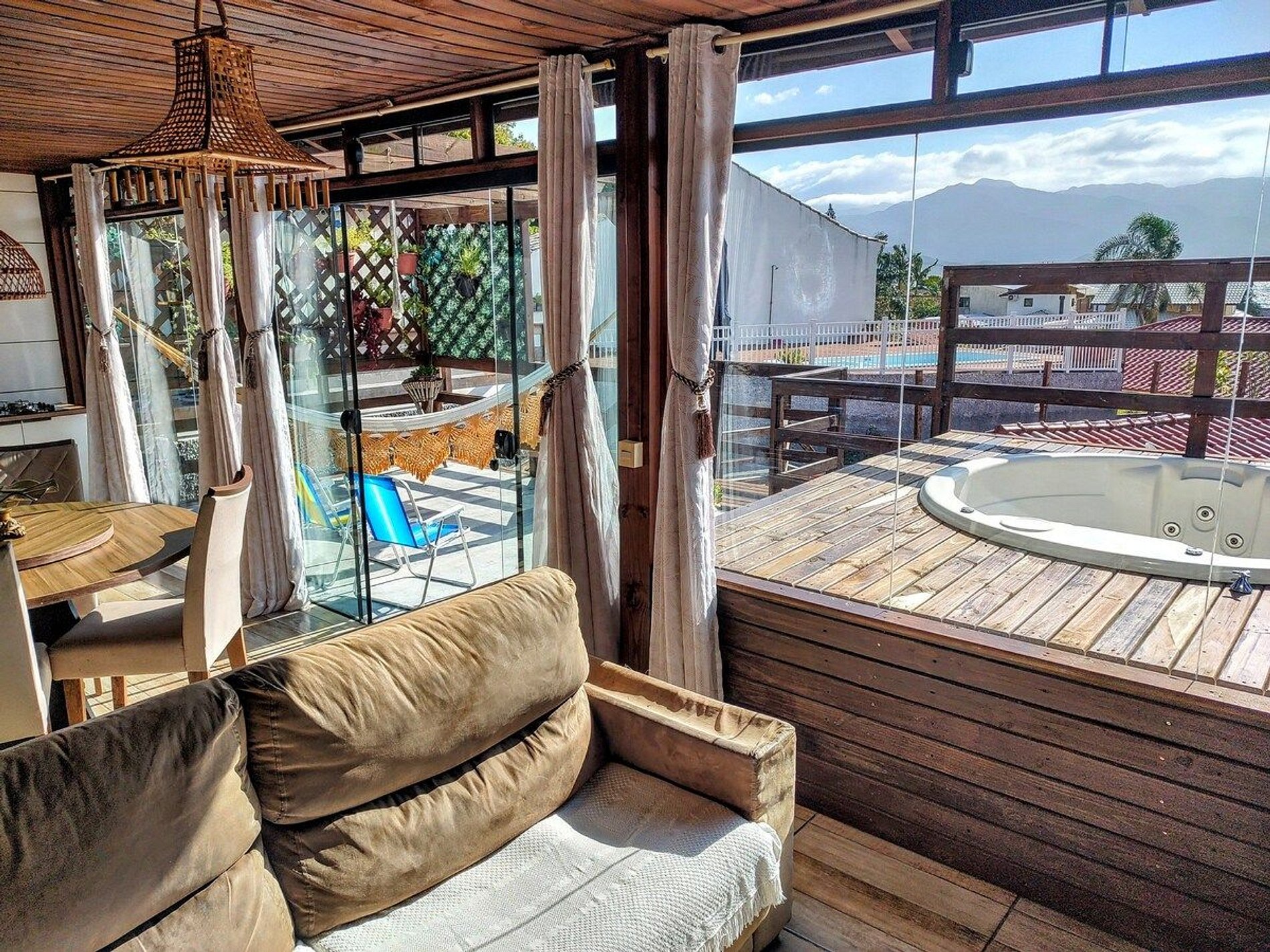 Aproveite todo o espaço da casa com total liberdade. Na área externa possui pergolado e SPA com hidromassagem, aquecedor e cromoterapia, ideal pra relaxar e contemplar a vista para o mar e o pôr do sol no Morro do Cambirela (o mais lindo de Florianópolis).