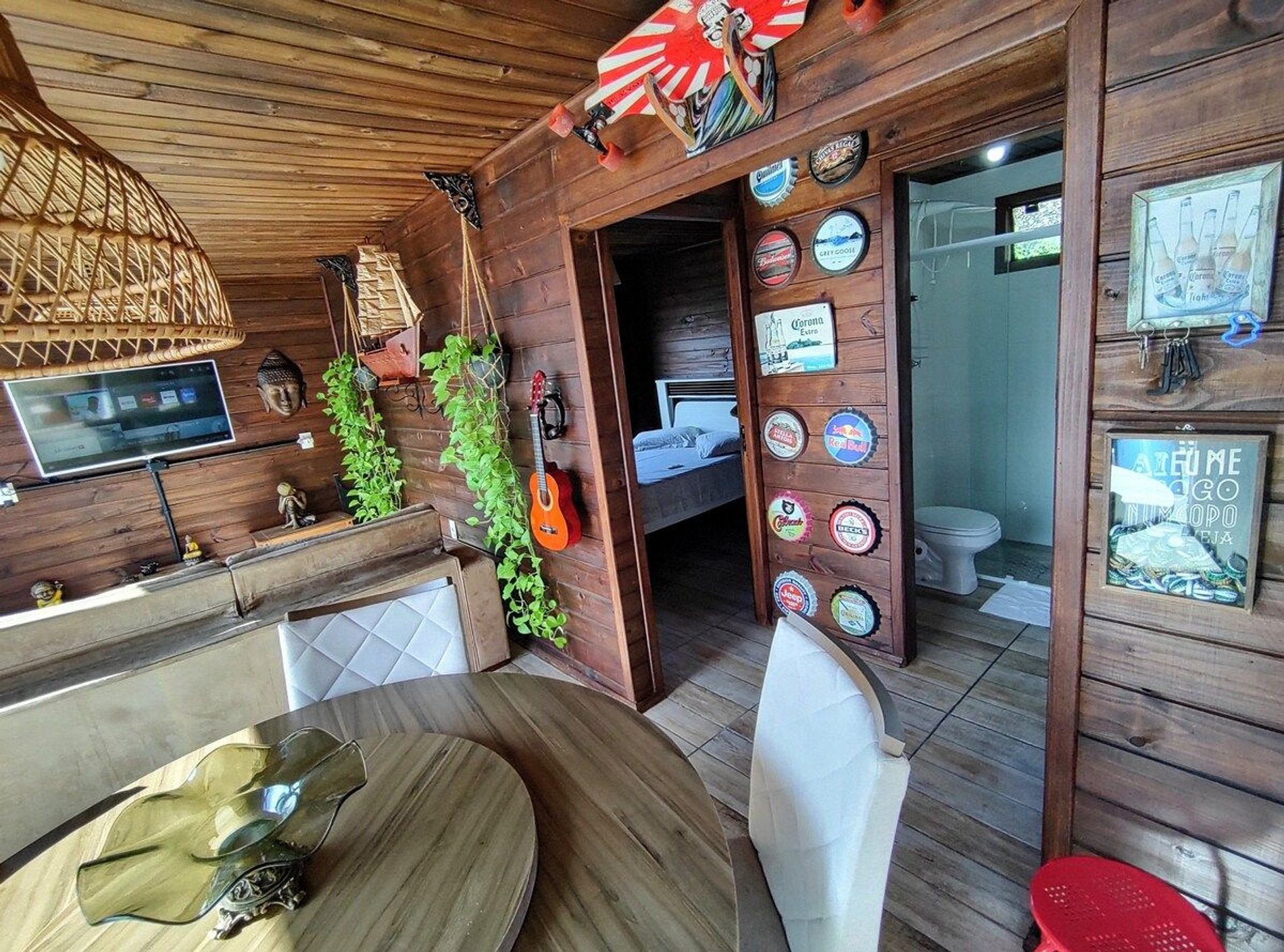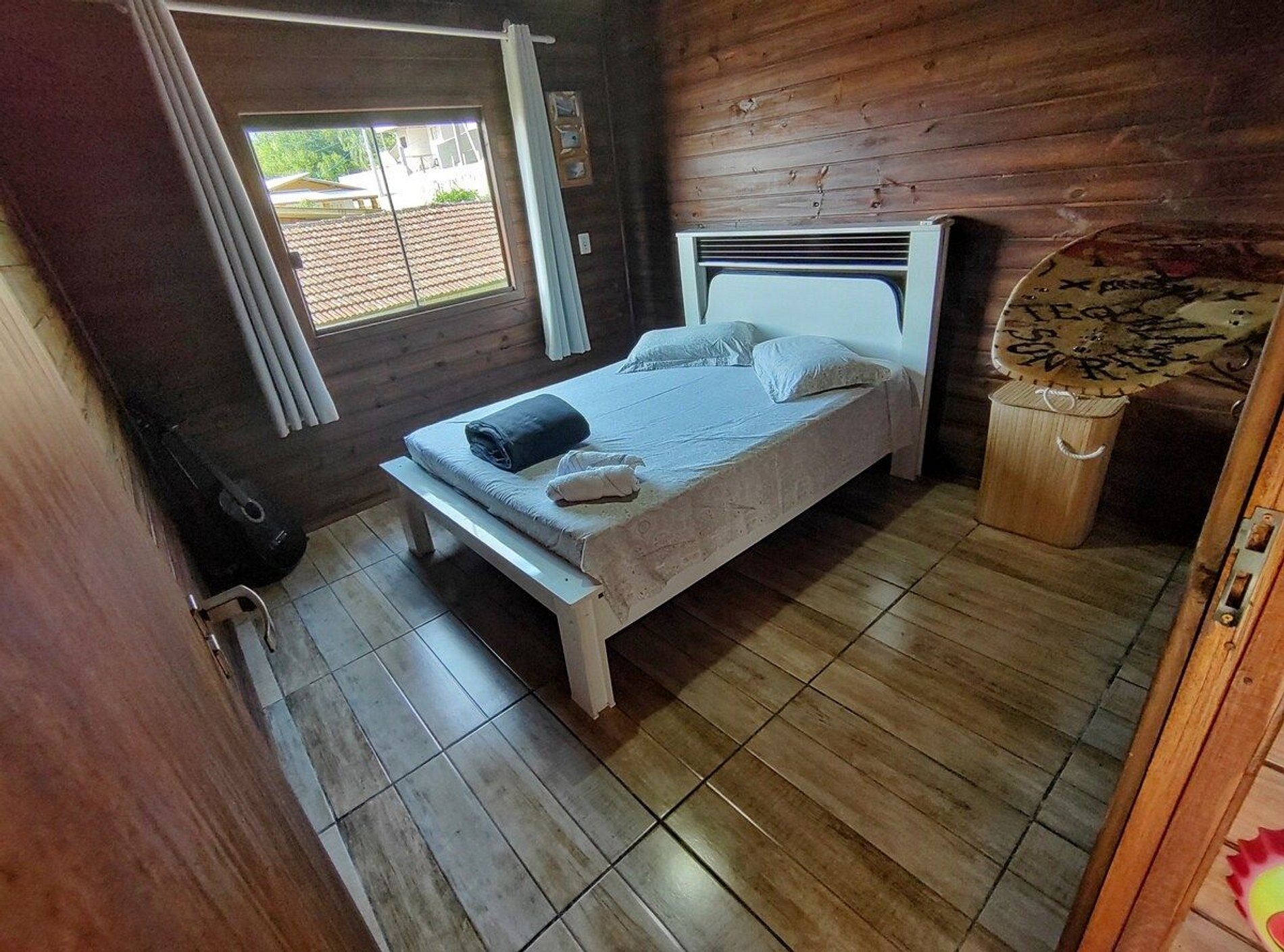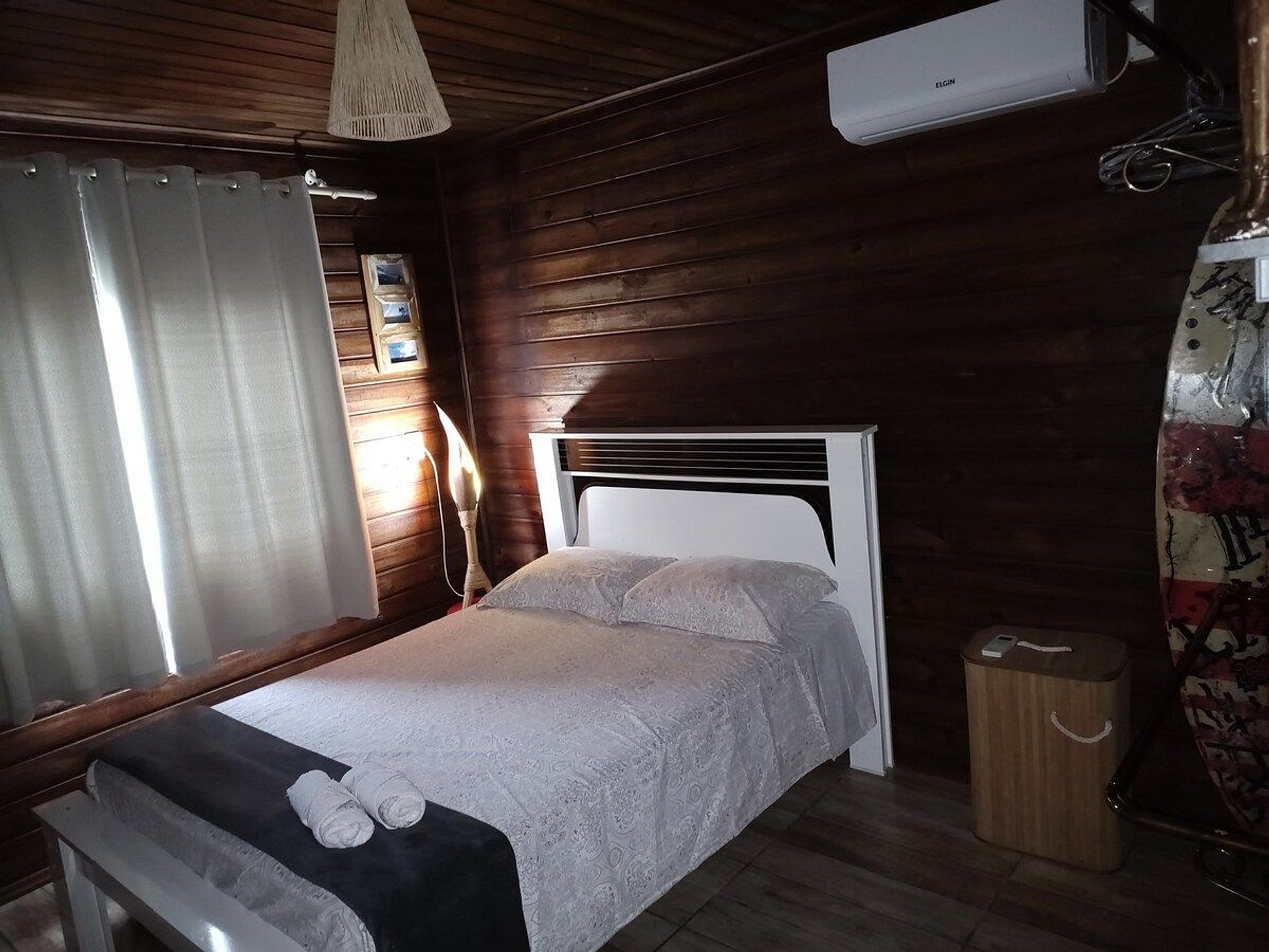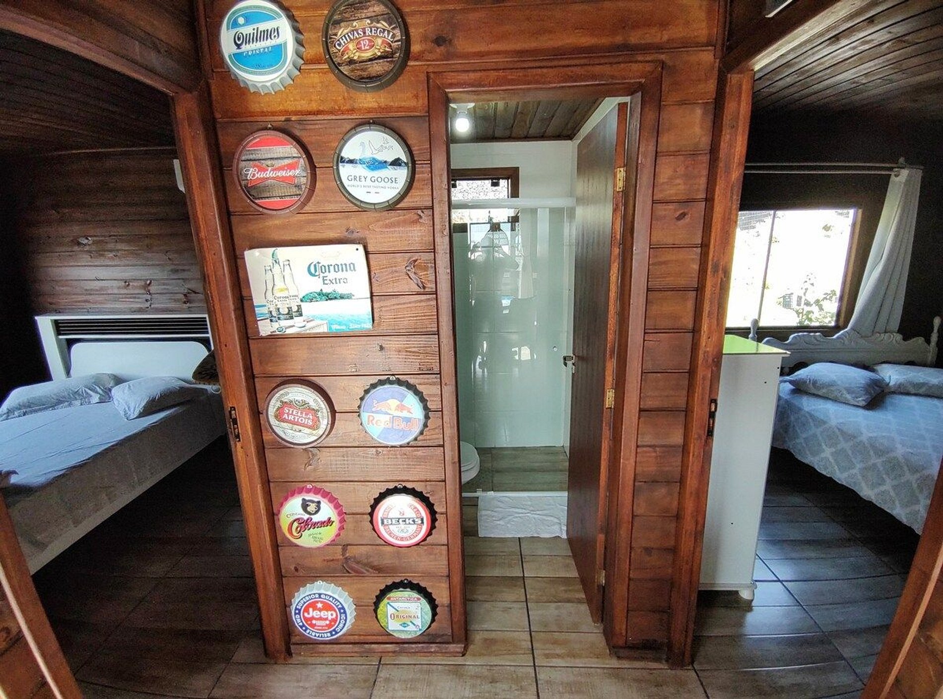 Dois dormitórios, com camas de casal e cortinas com blackouts. Um deles possui ar condicionado silencioso Um banheiro de uso coletivo.