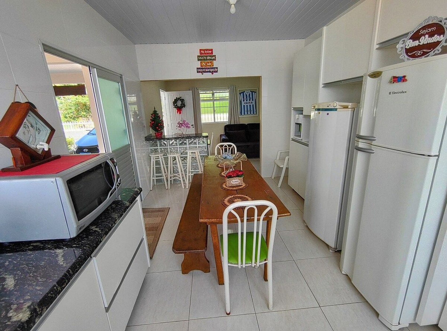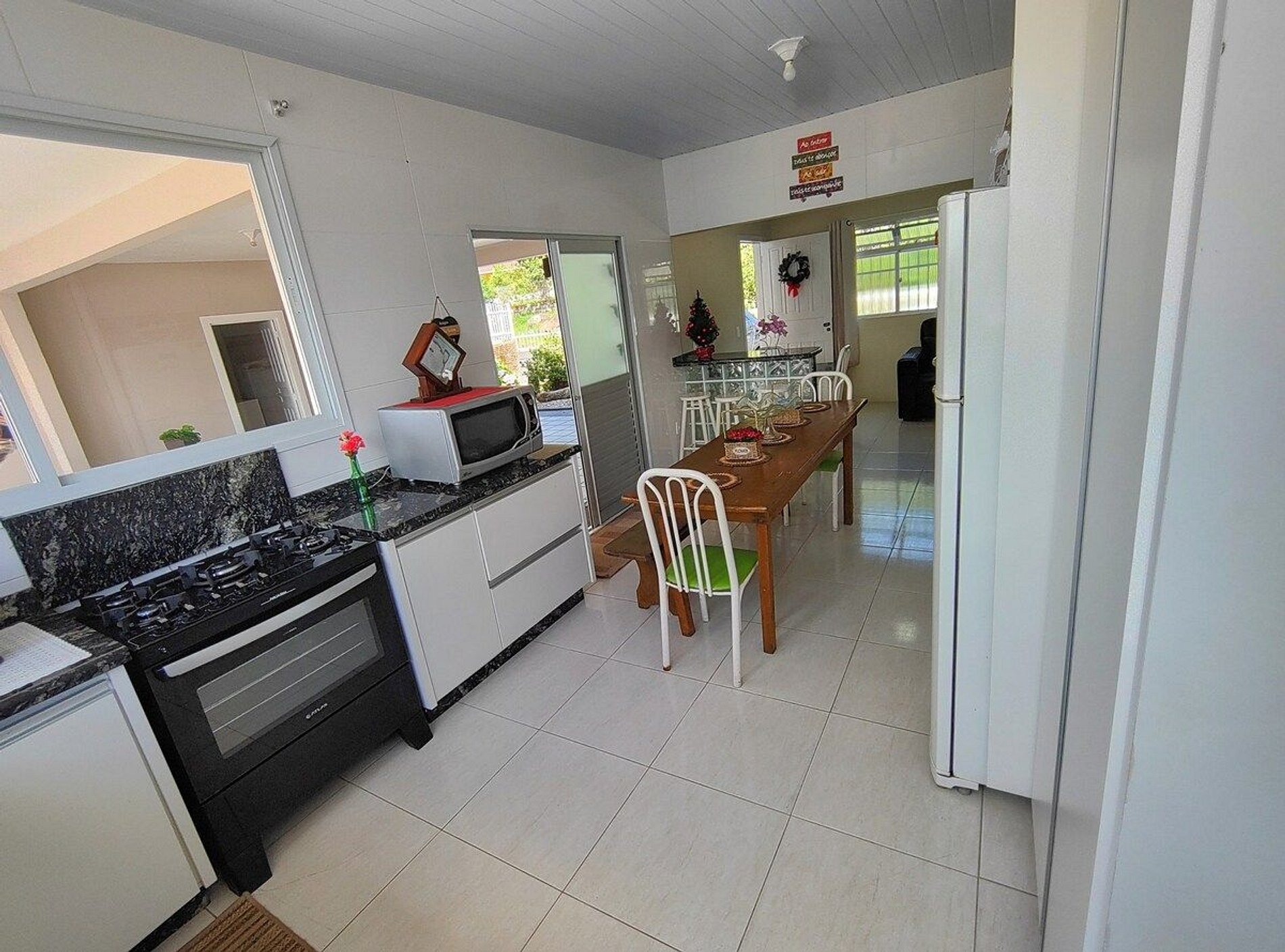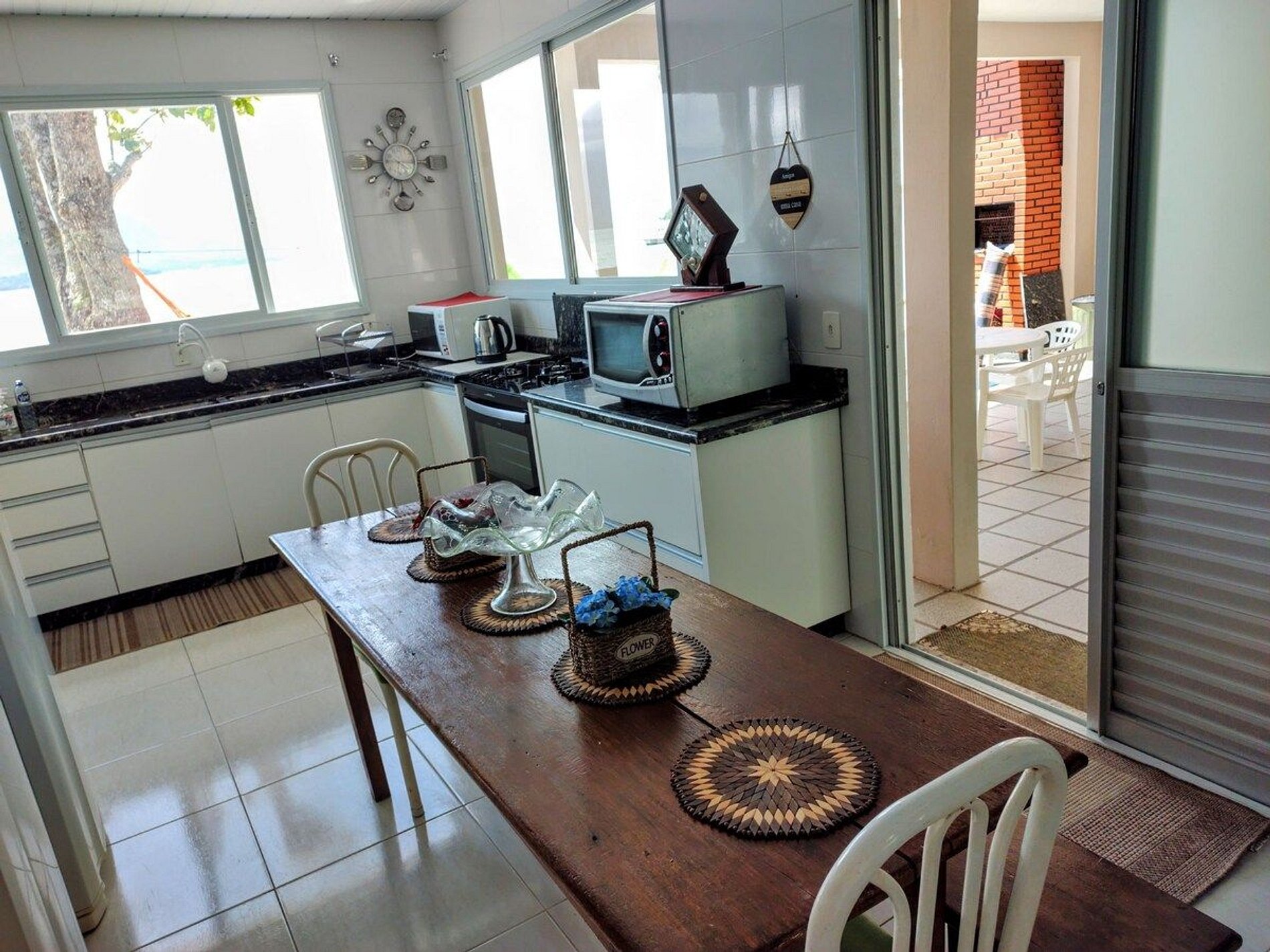 Uma casa com bastante luz natural, bem equipada com tudo que você precisa para realizar ótimas refeições em grupo: jogos de panelas, frigideiras, talheres e pratos, churrasqueira, utensílios de churrasco, fogão a lenha, xicaras para café, jogos de copos e pratos, liquidificador, cafeteira e coador, e eletrodomésticos variados.