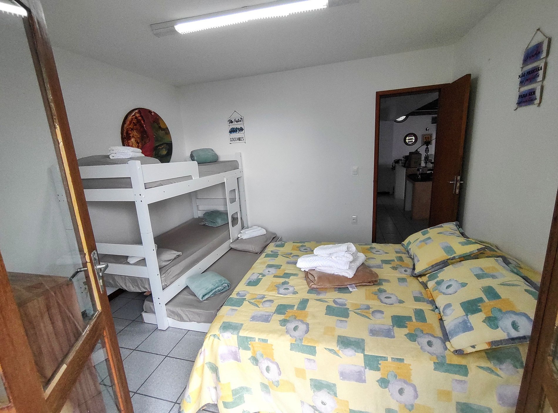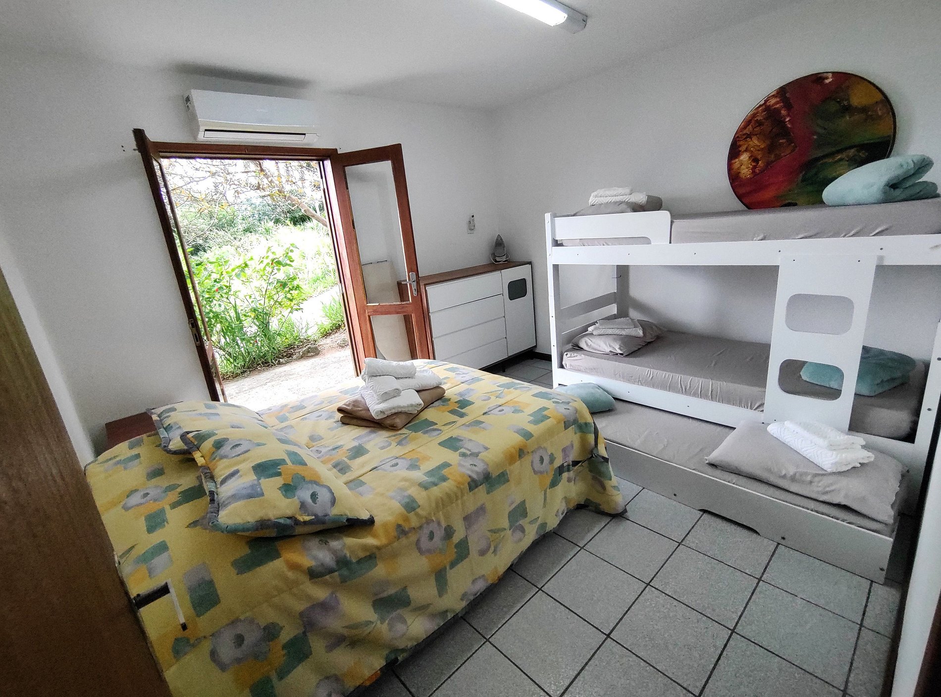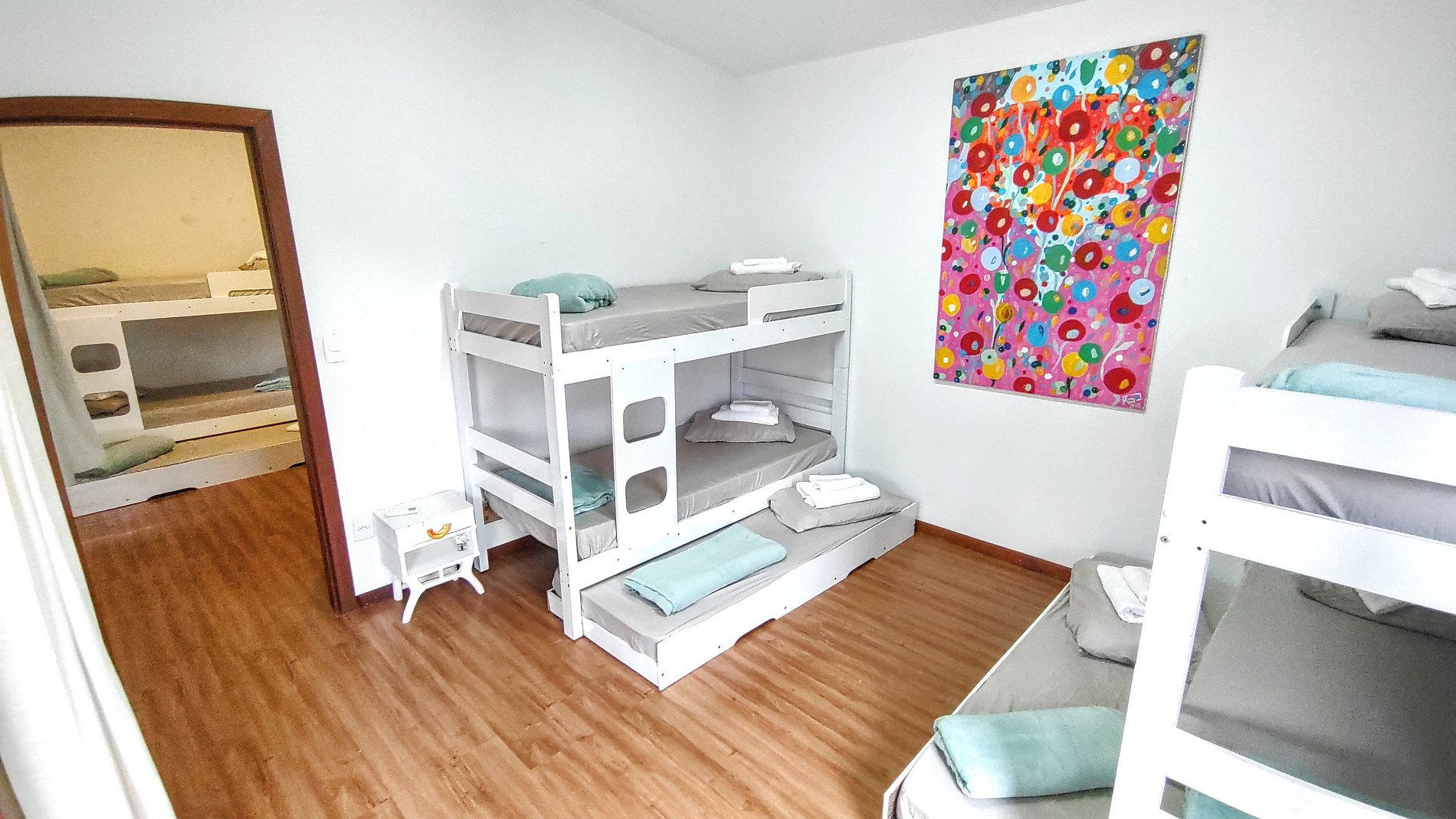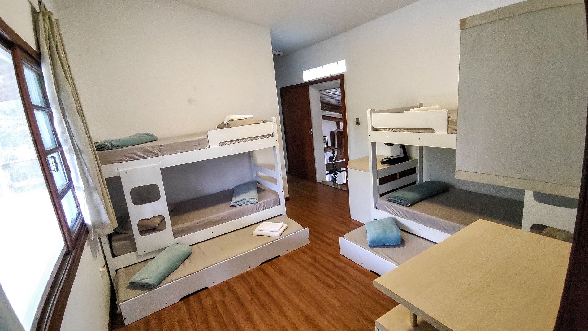 Três quartos com seis treliches (beliches com cama infantil auxiliar) + duas camas de casal no total. Cinco banheiros, garagem coberta para dois carros e estacionamento gratuito incluso no amplo pátio externo da residência.