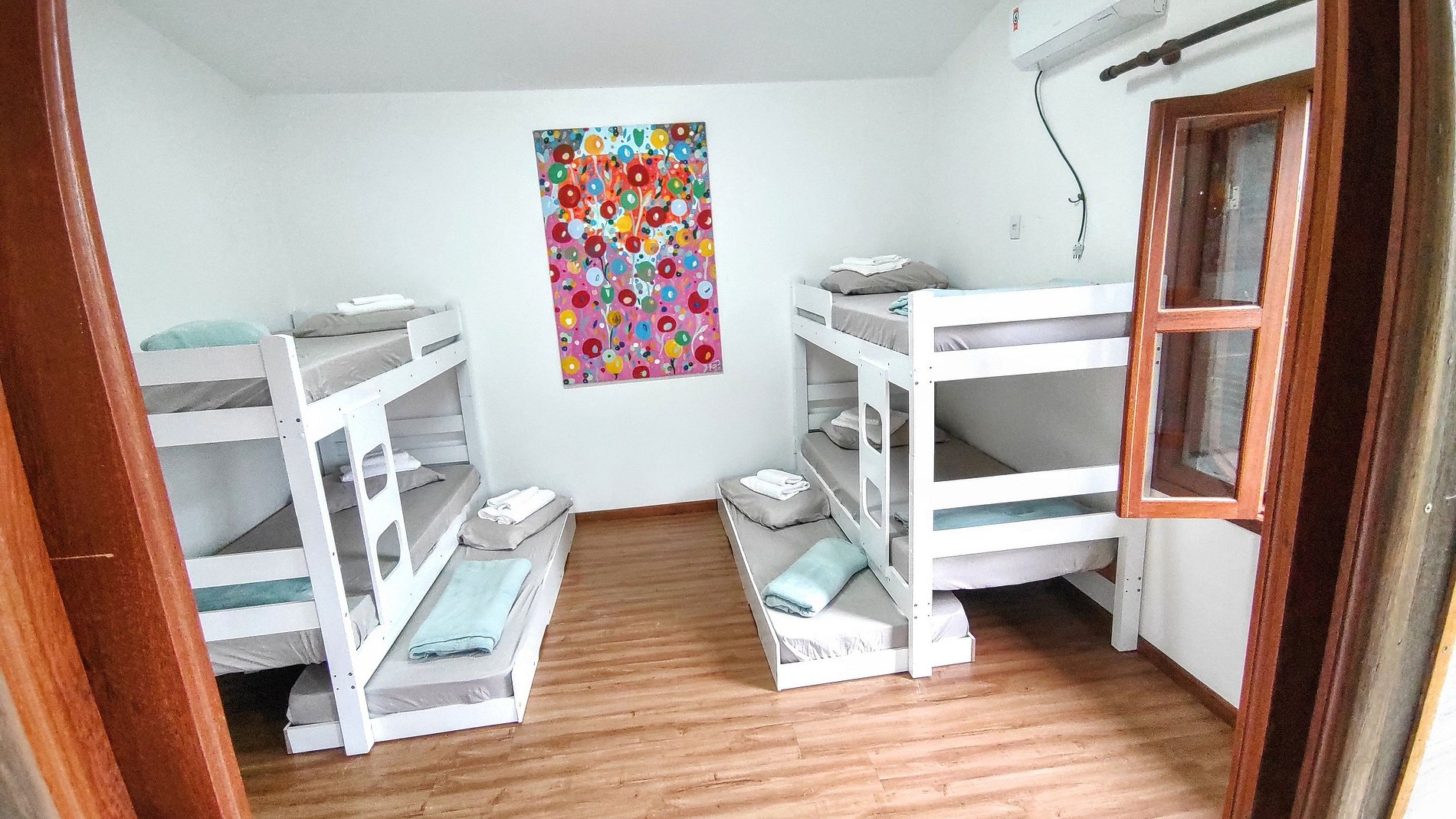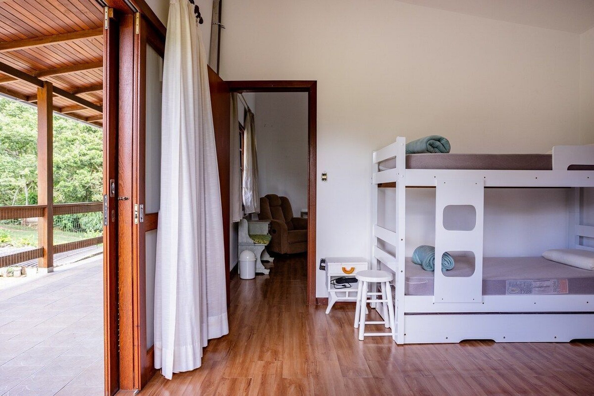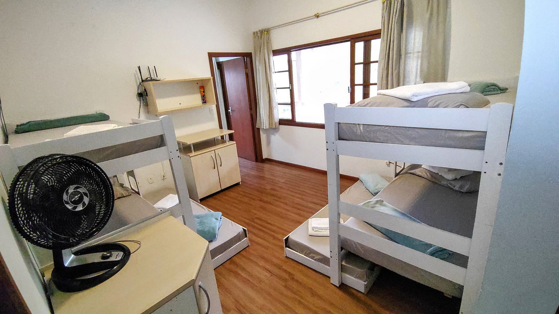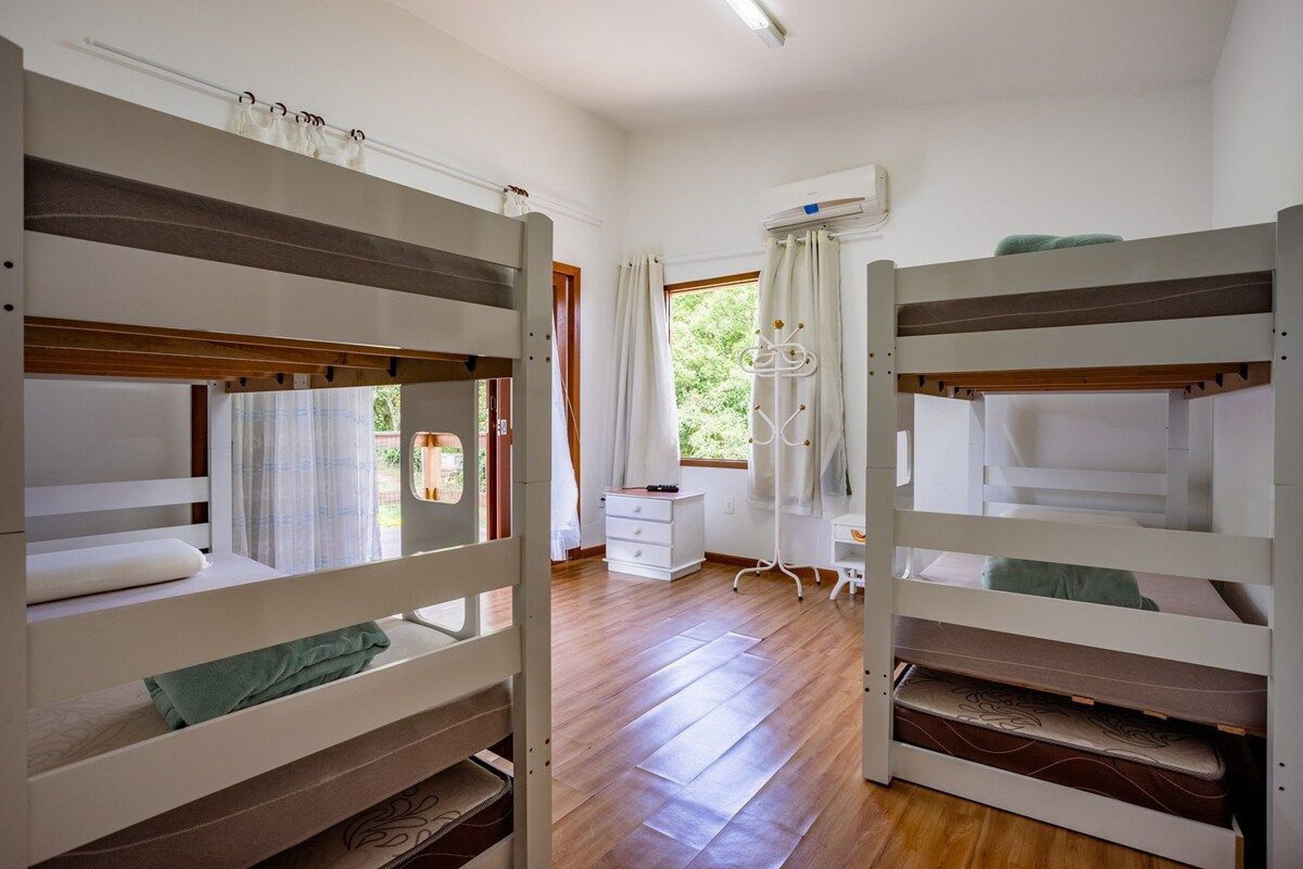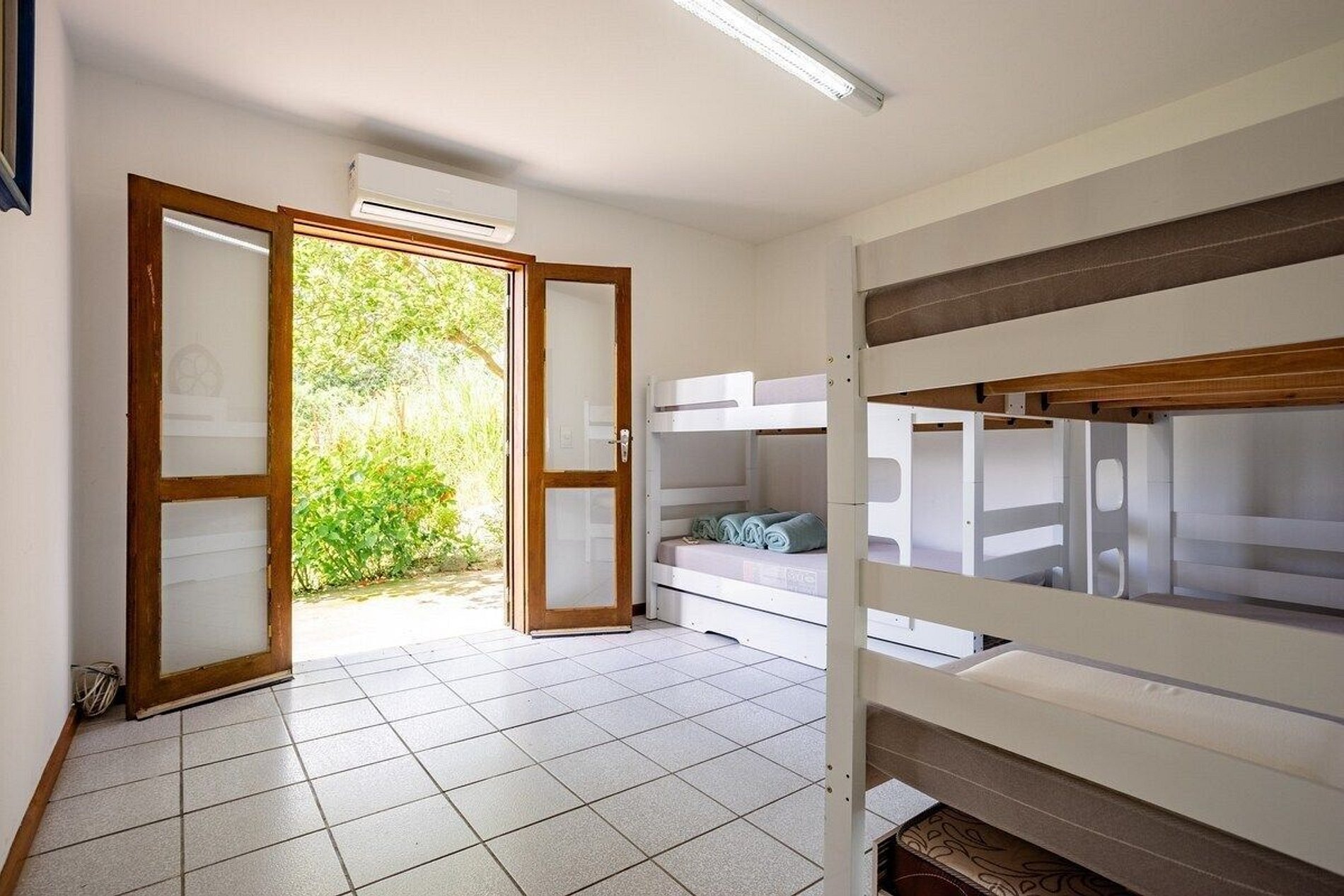 Três quartos com seis treliches (beliches com cama infantil auxiliar) + duas camas de casal no total. Cinco banheiros, garagem coberta para dois carros e estacionamento gratuito incluso no amplo pátio externo da residência.