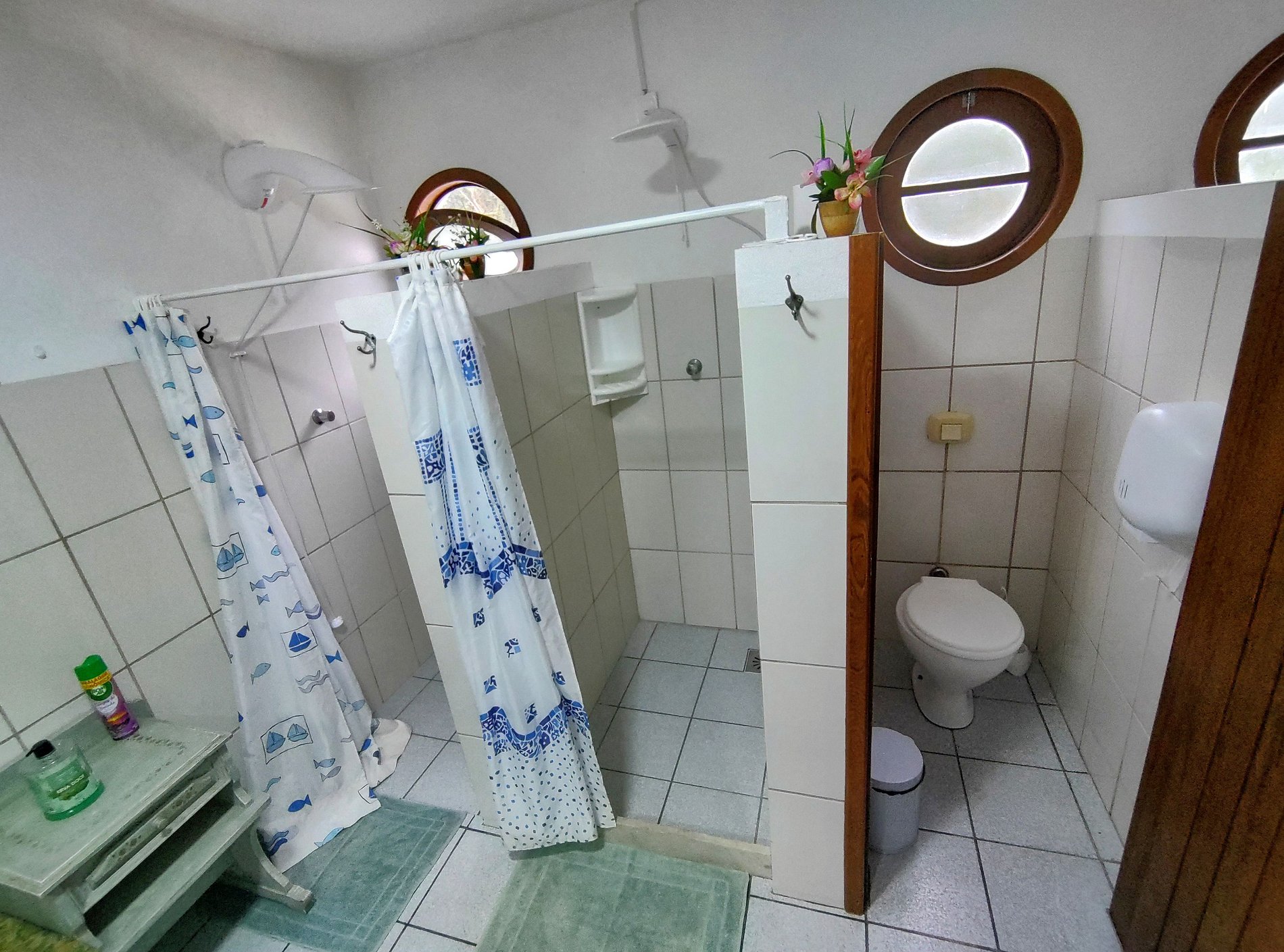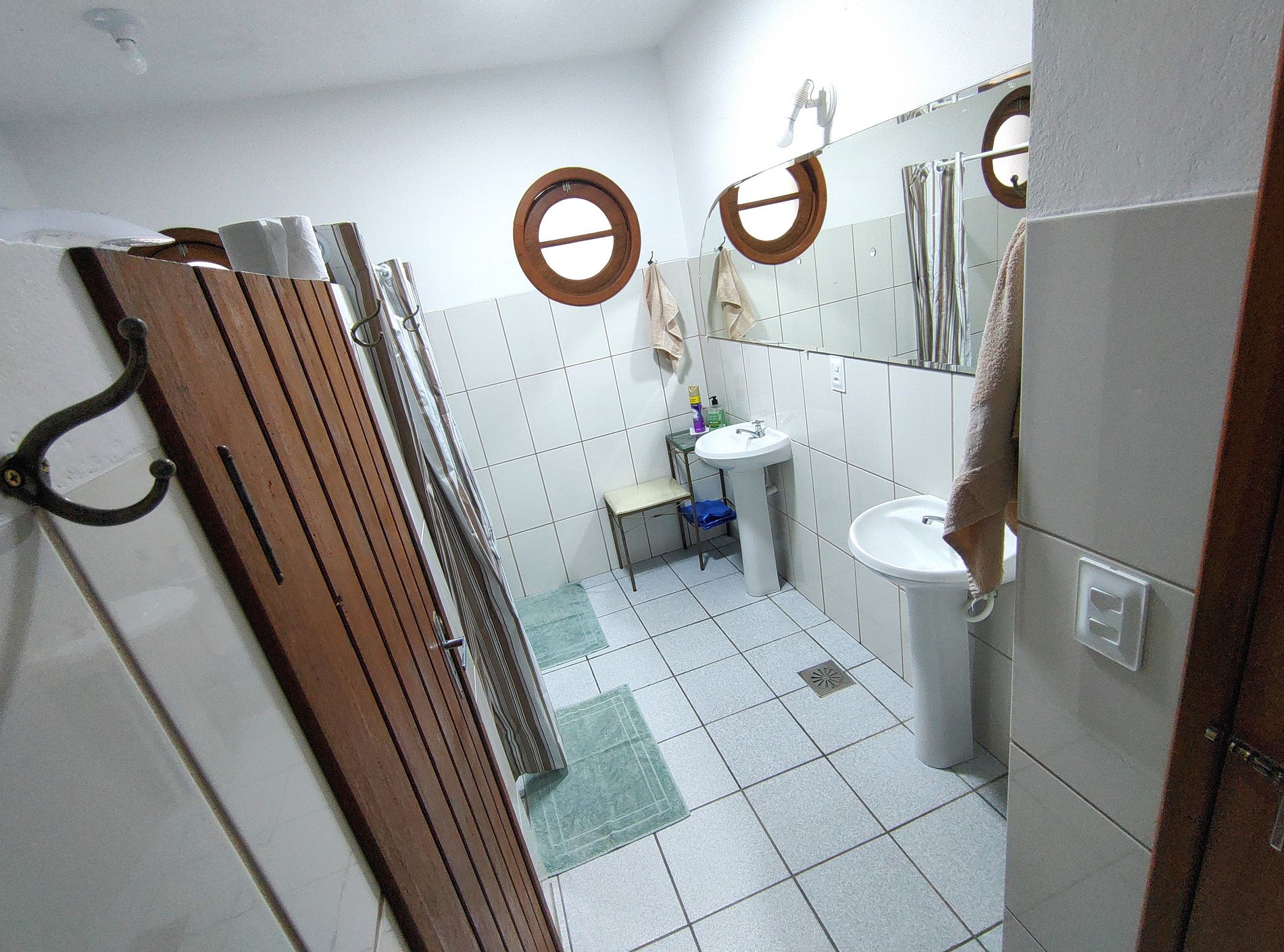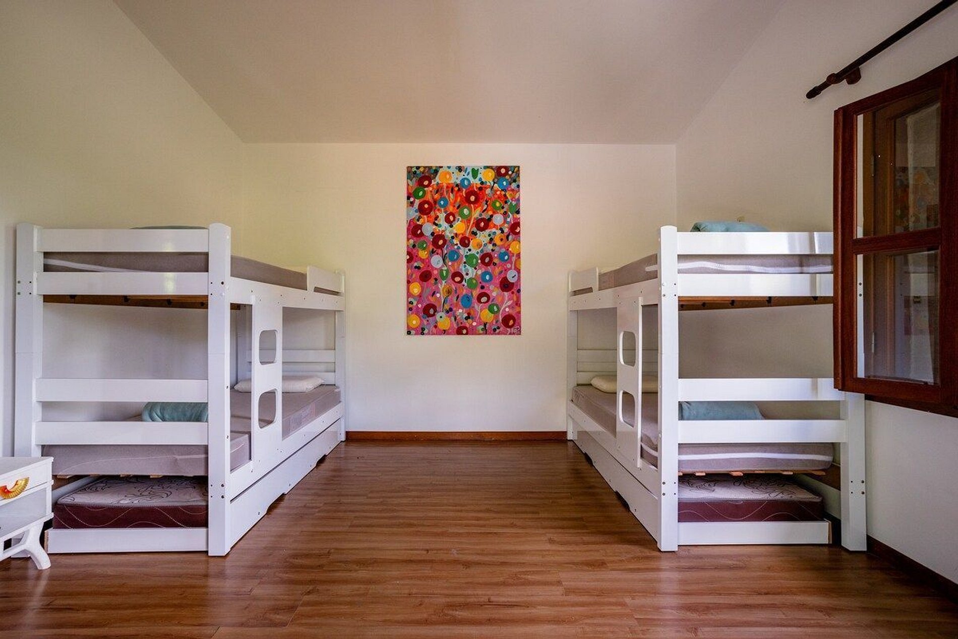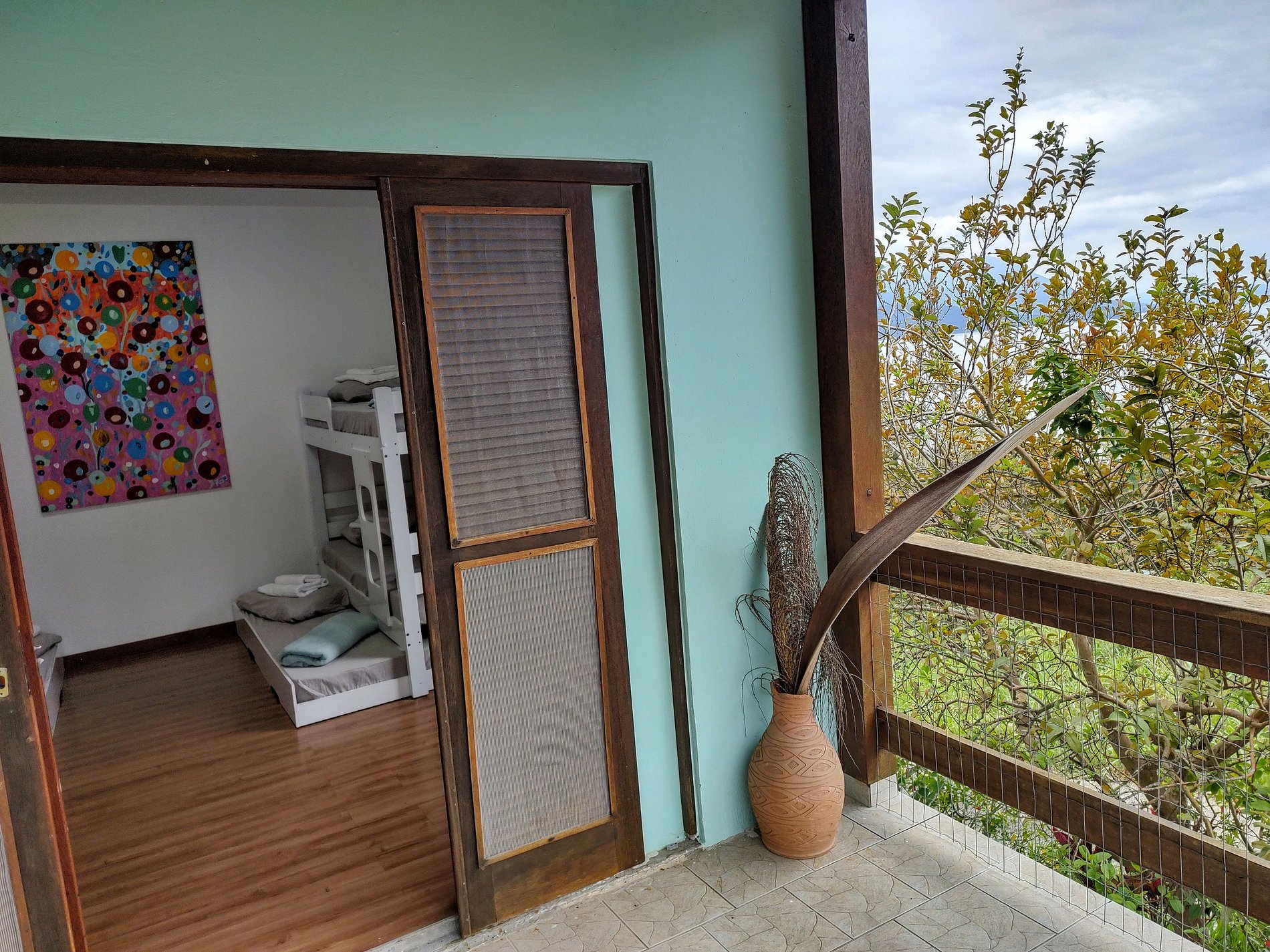 Três quartos com seis treliches (beliches com cama infantil auxiliar) + duas camas de casal no total. Cinco banheiros, garagem coberta para dois carros e estacionamento gratuito incluso no amplo pátio externo da residência.