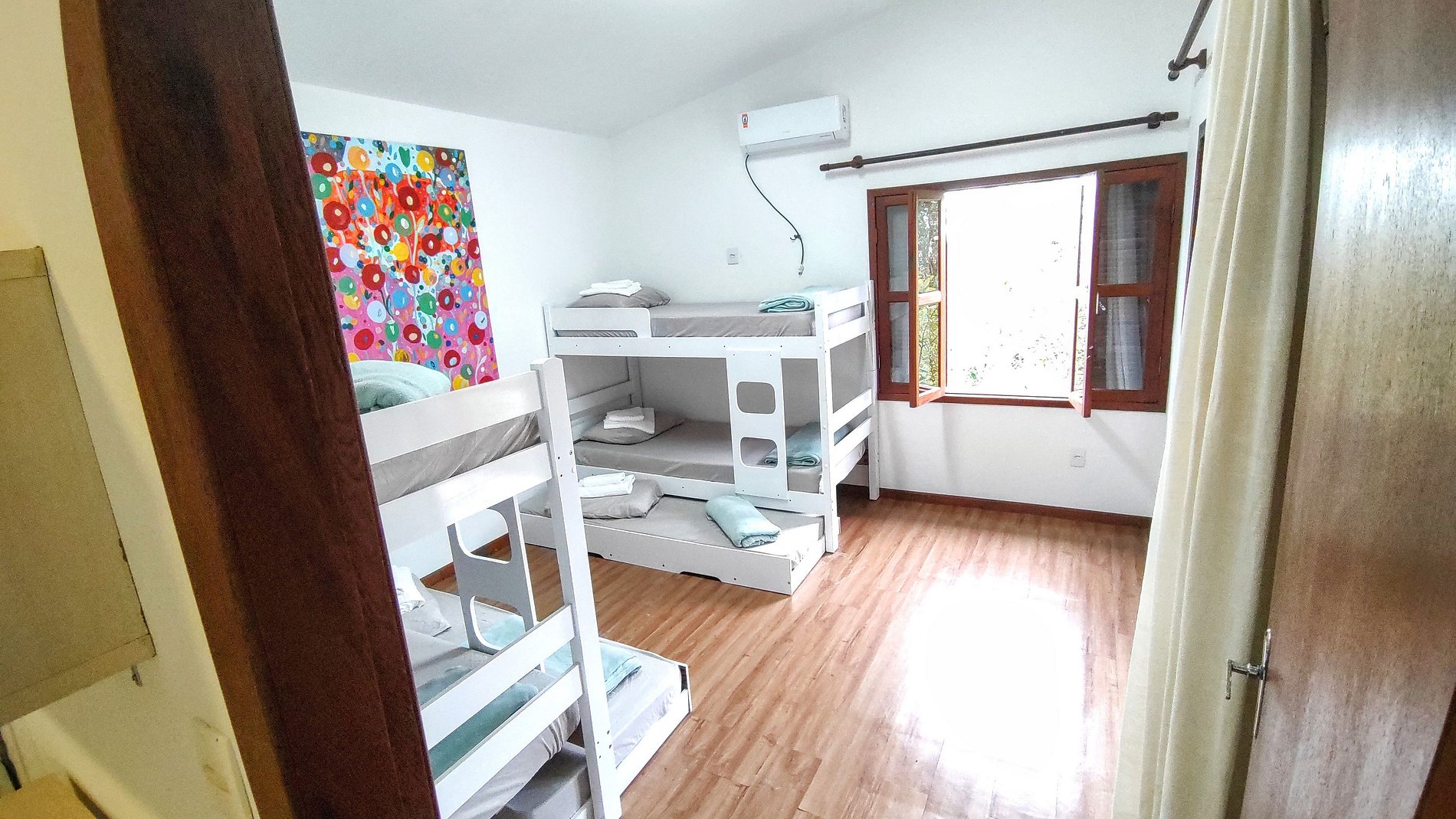 Três quartos com seis treliches (beliches com cama infantil auxiliar) + duas camas de casal no total. Cinco banheiros, garagem coberta para dois carros e estacionamento gratuito incluso no amplo pátio externo da residência.